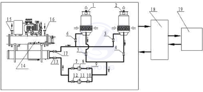 附圖1中:1為第一冷卻塔、2為第二冷卻塔、3為第二冷卻塔進水調節閥、4為第二冷卻塔出水調節閥、5為第一冷卻塔出水調節閥、6為第一冷卻塔進水調節閥、7為第一水泵出口調節閥、8為第一水泵、9為第一水泵進口調節閥、10為第二水泵進口調節閥、11為第二水泵、12為第二水泵出口調節閥、13為冷凝器進水調節閥、14為冷水機組、15為蒸發器出口、16為蒸發器進口、17為冷凝器出水調節閥、18為PLC控制系統、19為計算機系統。