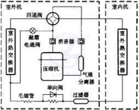 熱泵式空調(diào)器主要包含:室內(nèi)換熱器、室外換熱器、壓縮機(jī)、毛細(xì)管、氣液分離器和四通閥等部件。