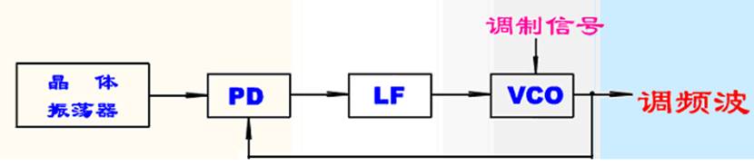 實現鎖相調頻的條件是調制信號的頻譜要處于低通濾波器通帶之外。使壓控振蕩器的中心頻率鎖定在穩定度很高的晶振頻率上,而隨著輸入調制信號的變化,振蕩頻率可以發生很大偏移。這種鎖相環路稱載波跟蹤型PLL。