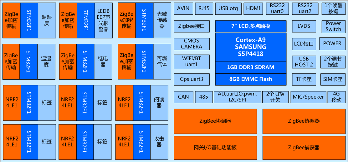 (2)物聯網網關≥1個:主芯片:采用S5P4418 Cortex-A9高性能處理器,可插接通訊模塊:ZigBee 2.4GHz,WIFI/BLuetooth二合一模塊、GPS定位模塊、4G移動通信模塊等。外設接口包括:以太網、串口、485、CAN、USB、USB otg、攝像頭、TF卡槽、模擬攝像頭TV、HDMI、按鍵等。
