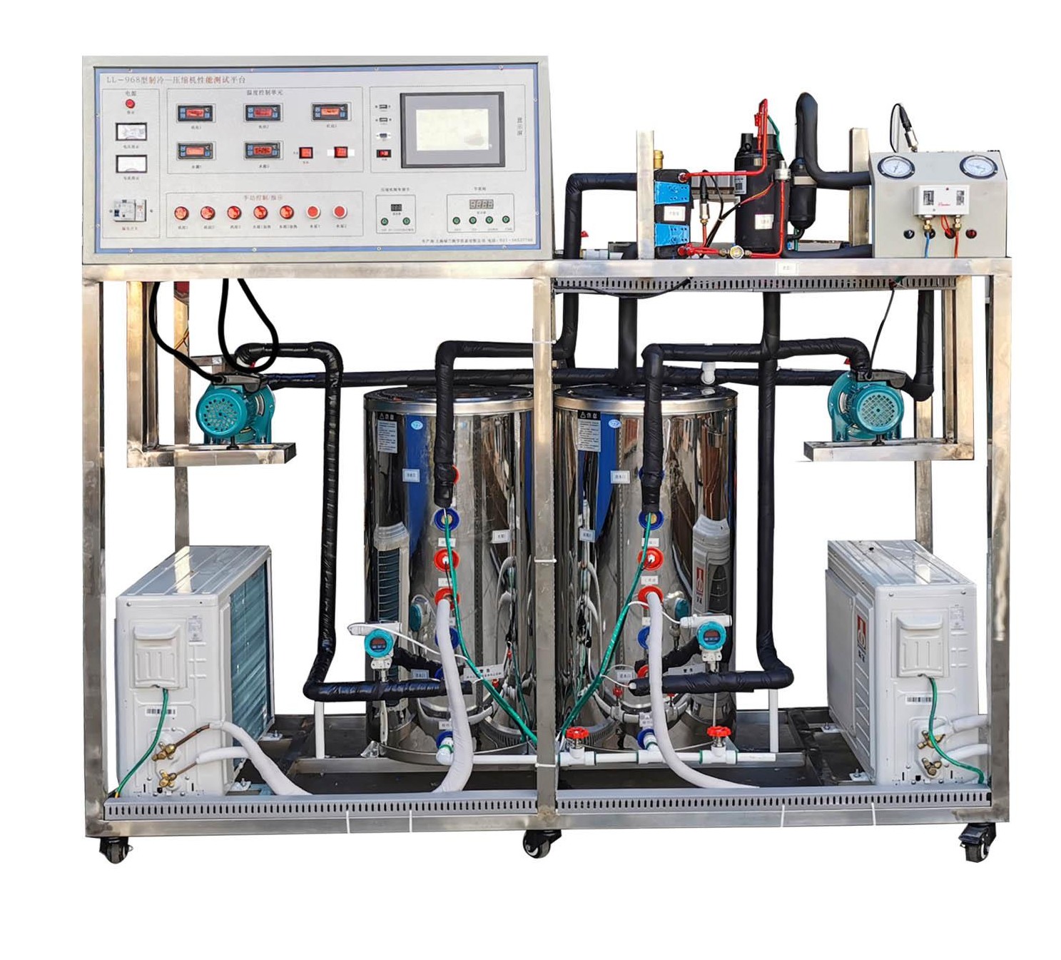 LGZL-RB01型 熱泵-壓縮機性能實驗系統采用熱平衡法測量熱泵與制冷壓縮機的性能。系統主要由制冷壓縮機、蒸發器、冷凝器、恒溫水箱和電子膨脹閥等組成。采用傳感器和檢測儀表采集蒸汽壓縮式制冷循環過程中的溫度、壓力、流量、壓縮機功率、電流、頻率等狀態參數,經自行研制的數據采集板卡連接到計算機,基于面向對象技術開發的具有實時性高,界面設計人性化等特點的測控軟件實現熱力循環過程實時動態顯示、性能參數測試和計算,構成具有檢測、分析、記錄、測試、繪圖等多功能一體化的熱泵-壓縮機性能實驗系統。基于基礎型機組,增加如下內容:學生設計型與創新型實驗。