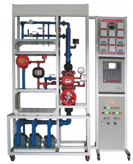 本裝置采用高級鋁型材框架開放式結(jié)構(gòu)設(shè)計,主要由濕式報警閥、信號閘閥、水力警鈴、水延遲器、各類噴淋頭、增壓泵、恒壓泵、壓力開關(guān)、水流指示器、壓力表、末端試水裝置、透明有機玻璃水箱、水泵控制箱、火災(zāi)報警控制器、聯(lián)動控制模塊、基于BACnet總線網(wǎng)絡(luò)的DDC控制器、手閥及各類水管等組成。