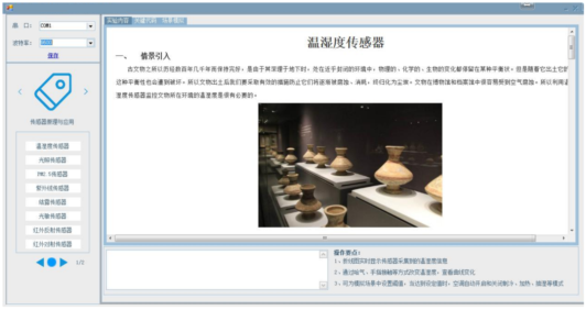 物聯網基礎技術原理教學平臺的軟件模塊,采用C#上位機教學資源軟件及聯動場景案例,針對傳感器技術的教學,每一個傳感器的原理、實驗目的、實驗原理、實驗內容、實驗步驟、等實驗指導書內容移植到軟件模塊上,同時對實驗過程、實驗現象相對應顯示出來,實現了理實一體化教學的效果。并且可以在此軟件模塊上加載各系列硬件模塊套件的教學資源,包括實驗場景引入,實驗目的,知識點掌握,實驗步驟,關鍵代碼解析,實驗現象及實驗場景聯動。能夠讓學生不僅學習傳感器概念、原理,并且可以在邊學原理邊練習操作和開發,生動且有趣。軟件模塊的界面截圖如下圖所示: