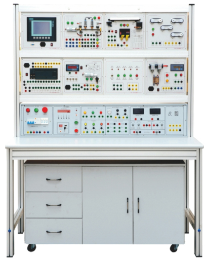 該裝置采用鋁木結構實訓臺,實訓臺架由實訓屏(含電源控制屏)、實訓桌、實訓儲物柜三大部分組成。實訓屏包括電源指示和控制單元、時間管理器(含電源保護)單元、指示燈和按鈕單元、選擇開關和蜂鳴器及繼電器單元、儀表單元、直流電源單元,電源控制屏的左右兩側分別裝有一個兩插插座,將外部電源進線端裝在電源控制屏的左側(采用航空插連接結構);實訓屏上部采用三根不銹鋼型材組成通用實訓模塊固定結構,一次可擺放8個實訓模塊,模塊采用標準化結構、互換性強,根據實訓內容的需要調換實訓模塊;存儲柜用于存放工具材料及模塊。