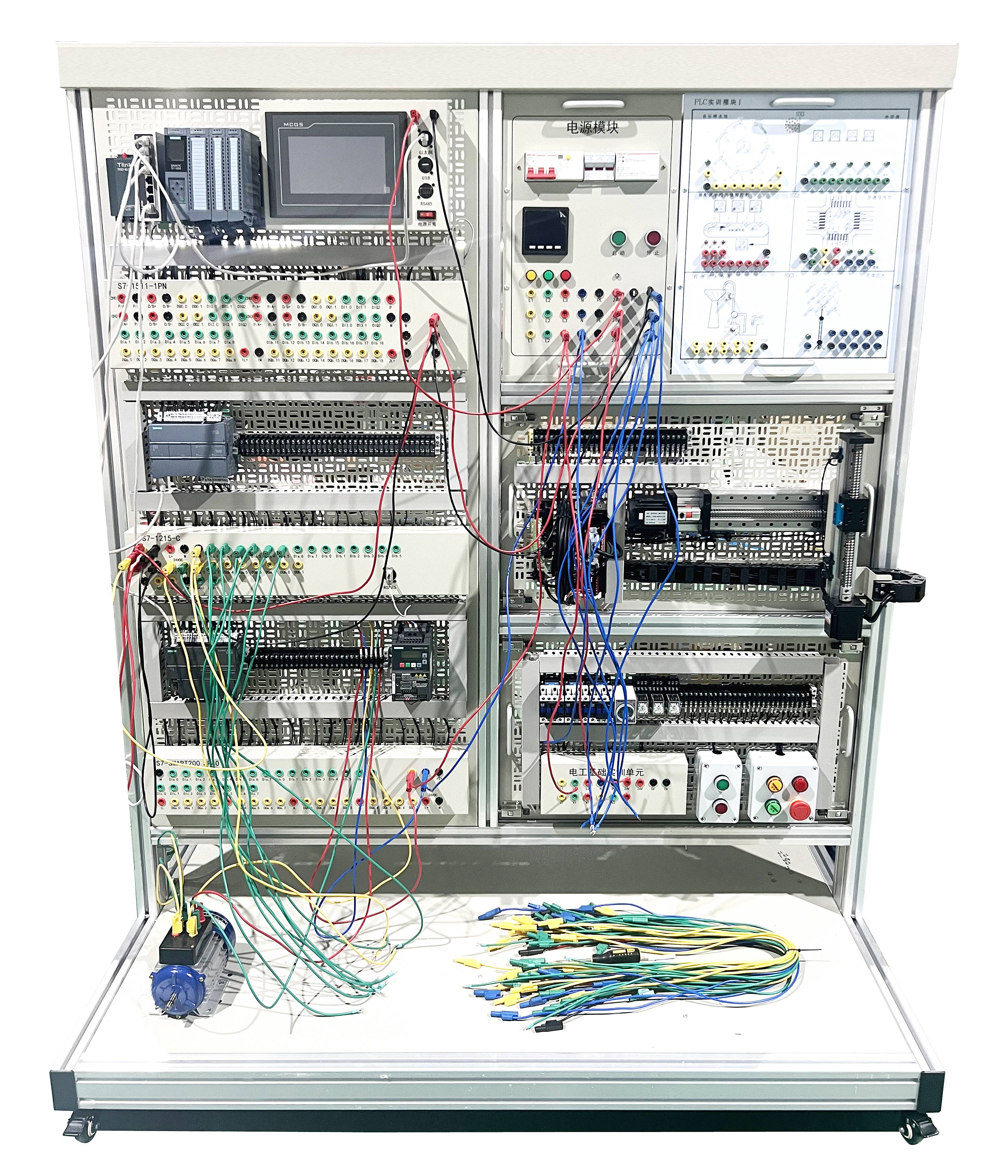 實訓裝置由S7-1500單元、S7-1200單元、變頻調速單元、伺服電機、實訓組件、電工基礎實訓單元二維絲桿控制單元、觸摸屏單元、以太網交換機、交流電機等組成。