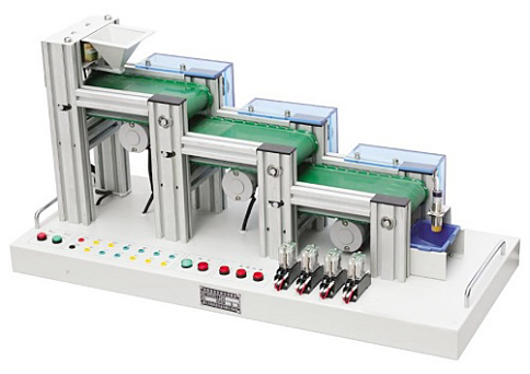 LGP-MSL01型 自動送料裝車實訓模型能模擬實際的自動送料裝車系統的工作狀況,由漏斗上料裝置、三級傳送帶、電磁鐵、直流電機、電容傳感器、故障開關、指示燈、模擬小車等組成,通過PLC編程,對電機、電磁鐵進行較復雜的開關量控制、時序邏輯控制,完成自動上料過程。自動送料裝車實訓模型還設置了故障開關,可使學生掌握自動送料裝車系統的操作及故障檢測能力,是各類院校電氣類專業進行實訓的理想模型。