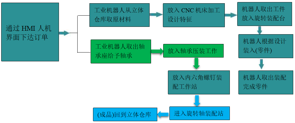 工業機器人智能制造創新設計裝配工作站以一個完整工業產品 萬花旋轉筆筒為生產制造主 線,可以完成整個產品的材料 存儲管理、原材料加工、六面 多種裝飾片組裝、深溝球軸承 壓裝、底板內角螺絲銷緊、旋 轉軸任裝、成品存儲等工作環 節。