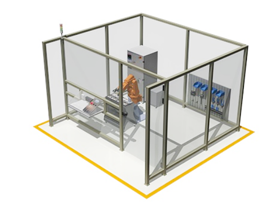 13、安全護欄:隔離護欄,高1000mm,框架采用2mm厚灰色棟梁鋁合金型材,鋼化玻璃10mm厚;工作站全部通透利于觀察,玻璃中間沒有隔斷;并安裝一個側開門;門上安裝安全檢測元件,機器人自動運行必須在門關閉狀態下進行;系統工作站安裝有3個急停按鈕,分別位于操作控制臺、模型安裝臺、隔離護欄上,以備緊急情況使用。