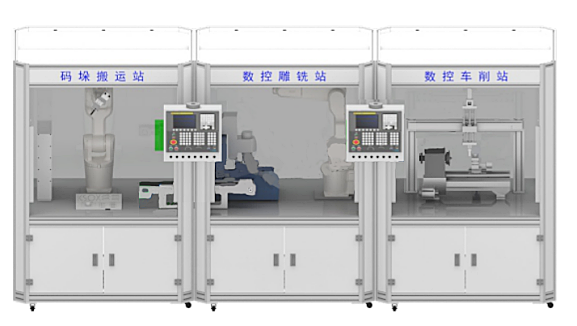 LGJ-SK01型 智能機器人模塊化數控加工集成制造實訓系統由三大站點模塊組成:工業機器人搬運碼垛工作站、數控雕銖機工業機器人上下 料工作站、數控車床桁架機械手上下料工作站。每個站點配套相應的軟硬件兩大部分,三種站點 既可以單獨訓練學習不同的功能,又可以組成智能制造生產線學習整個系統的運行原理。