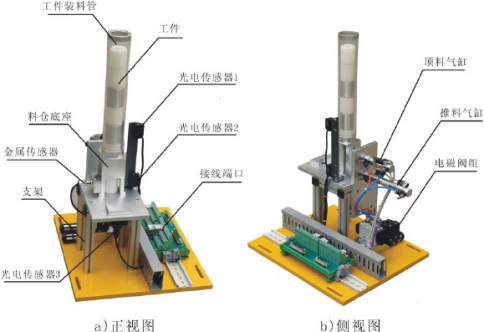 主要由井式工件庫、推料氣缸、物料臺、光電傳感器、磁性開關、電磁閥、支架、機械零部件構成。