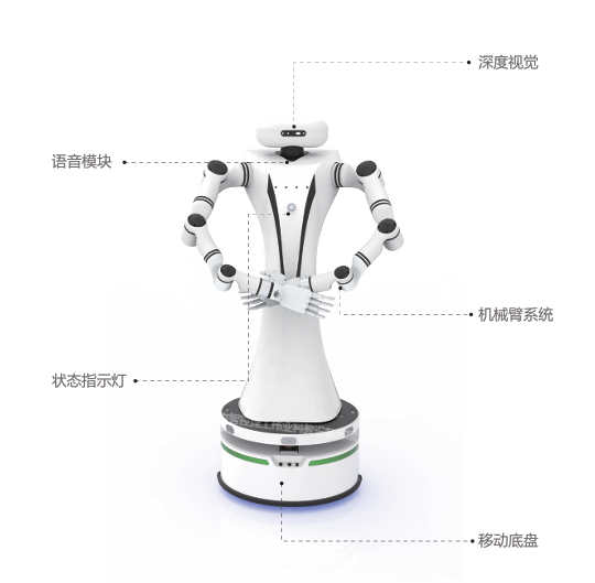 一.機器人整體組成:不少于1個主控模塊、不少于1個移動底盤、不少于2條七軸機械臂、不少于1個末端執行器、不少于1個深度視覺傳感器;