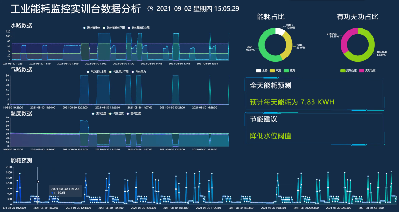 LGHL-04型 工業互聯能耗監控實訓臺以水、氣、電能耗監測為背景,采用液位計、流量計、溫度變送器、壓力變送器、電磁閥、水泵、氣泵、電氣控制箱、水箱等裝置模擬工業場景下的水循環、氣循環、電能監測常見的過程控制系統。其中水箱作為液體盛放和氣體導入的氣液混合容器,模擬化工行業常見的化工產品制備工藝場景。通過現場監控裝置及傳輸模塊,將液位、流量、壓力、水溫、氣溫、電壓、電流、電量等過程控制參數進行數據采集,傳輸到能源管理平臺,達到工業水、電、氣等至少三種數據采集控制、數據傳輸、數據存儲、數據分析及可視化展示的目的。