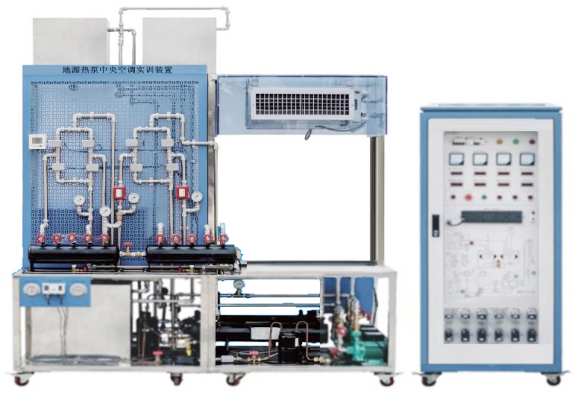 地源熱泵空調系統由制冷機組、模擬水井、空調系統、生活衛生供水系統、控制系統、實訓臺等組成。實訓臺采用不銹鋼底架結構,結構堅固,造型美觀大方;桌面用于安裝電源控制屏并提供一個寬敞舒適的工作臺面。