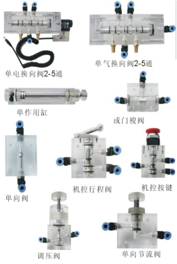 3、透明氣動與PLC實訓裝置各個透明氣動元件成獨立模塊,且裝有帶彈性卡扣底板,可方便、隨意地將元件安放在實訓面板(面板帶“T”溝槽形式的鋁合金型材結構)上。回路搭接采用快換接頭,布局靈活,拆接方便快捷。
