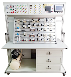 1、氣動PLC實訓裝置主框架由型材結構、費斯托氣動元件和電氣控制器件、可編程控制器(PLC)等組件組成。