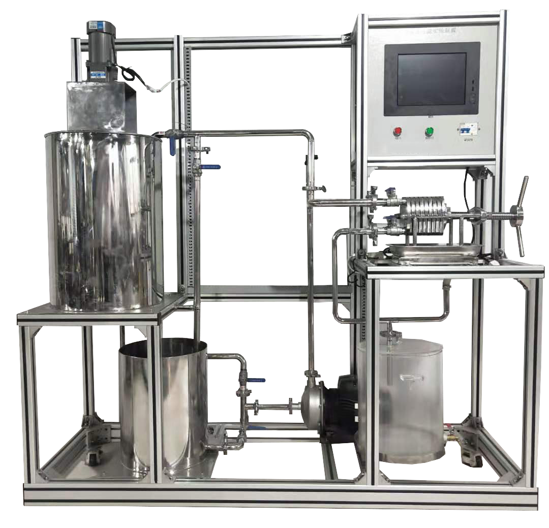4、該實驗裝置是由過濾板、過濾框組成的小型工業用不銹鋼板框過濾機,能完整地體現了板框壓濾機的構造和操作流程,采用氣動配料、氣動攪拌加壓技術,用空氣將物料注入過濾機,工程化概念強。