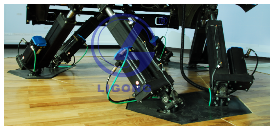 6自由度伺服電機控制電缸動感平臺,可實現前后、左右、上下三個方向的動態運動。伺服電動缸行程:200mm,前后傾角30º,左右傾角30º,水平轉角30º。承重:1000KG;總重250KG。采用高速六自由度反解算法,快速響應飛機的動態,達到與畫面完全同步的動態效果。