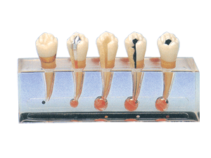 LG-Y10015-1 牙髓病臨床模型由因齲齒缺損形成齲洞、牙髓壞死(變黑),伴根尖膿腫和作好充填準備的前磨牙以及用合金充填修補的牙齒等5個部件組成,并顯示齲齒與牙髓炎伴根尖膿腫等病理過程以及臨床治療。